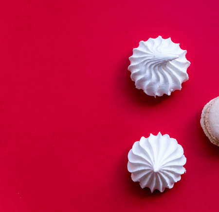 Top view of colorful macaron or macaroon on red pink background. selective focus. Flat lay with Almond cookies.Variety of macarons pastry and homemade white merengue. copy space