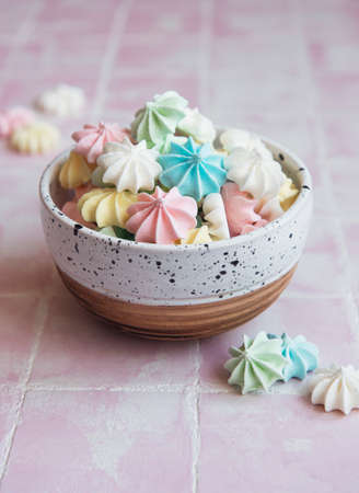 Close-up delicious meringue cookies pastel colors background. French pastries, sweet crunchy swirls candy