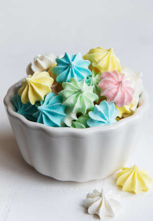 Homemade sweet colored meringue on white background.