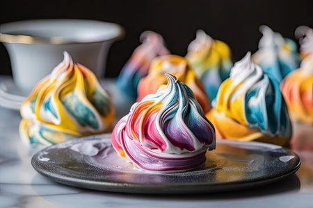 A tempting assortment of colorful meringues, with swirls of pastel colors, arranged artfully for a visually appealing dessert display.