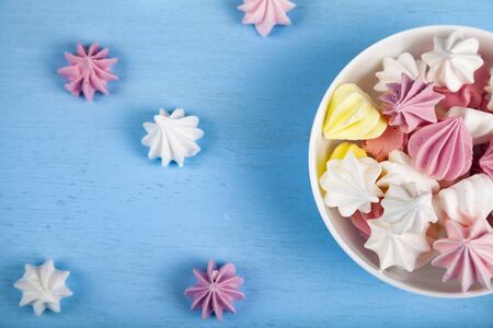 Meringue in a white bowl on a blue wooden background, top view. Delicious dessert. Colorful handmade meringue.