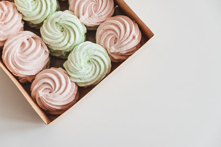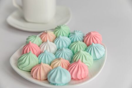 Meringues of a delicate pastel color are on the table for morning tea.