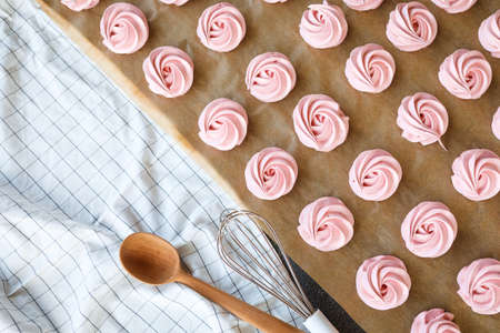 Top view of white and pink twisted meringues on pink background. French dessert prepared from whipped with sugar and baked egg whites. Greeting card with copy space