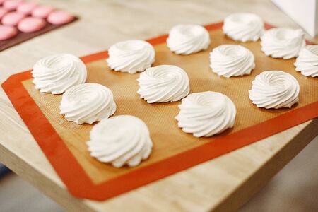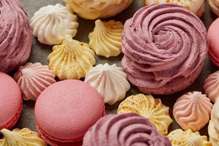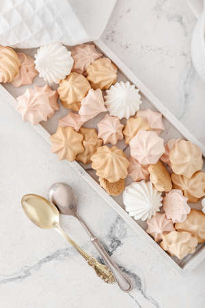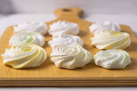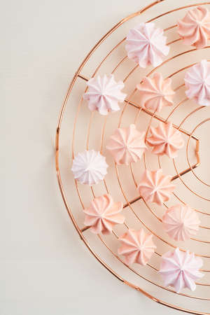 Closeup of french mini meringues cookies on food background.