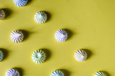 Sweet meringue on yellow background. top view. flat lay. Space for text