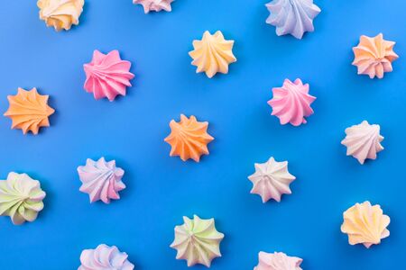 Colorful meringue cookies on blue background