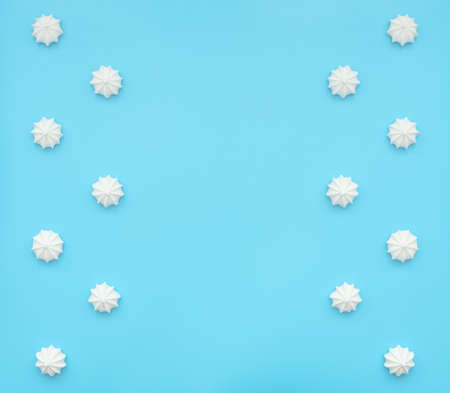 Delicious white merengues on blue background. Happy day, breakfast, good morning concepts. Time for tea or coffee. Greeting or invitation card. Flat lay style with copy space.