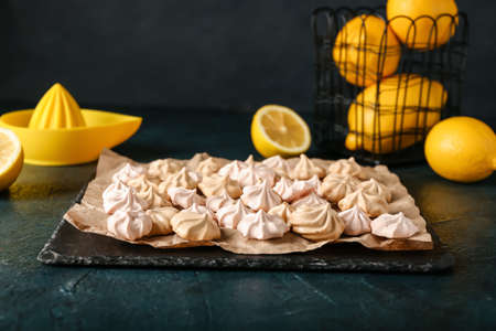 Board with tasty meringues on dark background