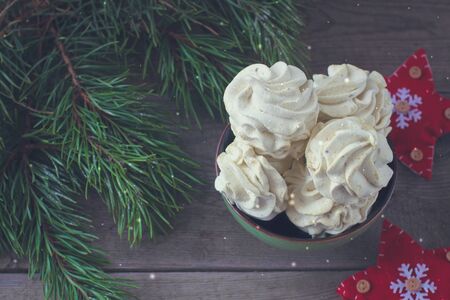 Still life in style of food. Culinary background with meringue on dark wooden background.