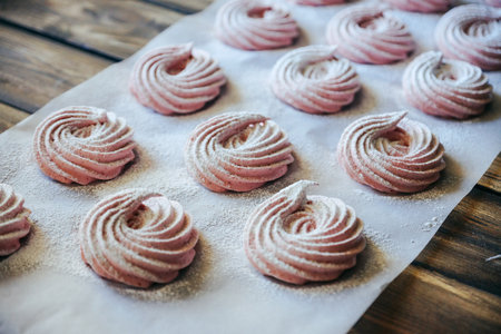 Homemade pink marshmallows on baking paper background on the kitchen.