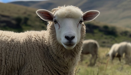 Sheep with tag in its ear standing in field. Generative AI.