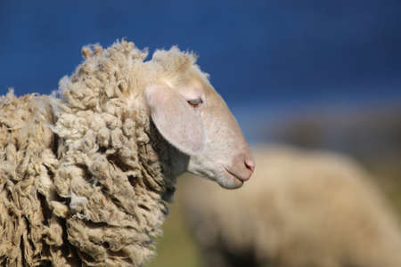 Sheep in the meadow. Close-up portrait of a sheep