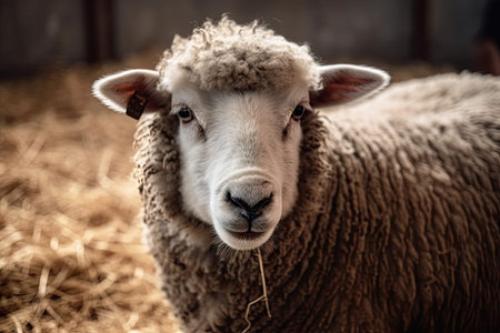 A serene close-up of a wooly sheep's face showcases the soft textures of its fleece. The gentle expression embodies a peaceful farm atmosphere.