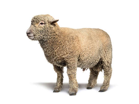 This striking image captures a realistic sheep with a soft, fluffy coat against a blank background, emphasizing its natural beauty and calm demeanor, perfect for various creative projects.