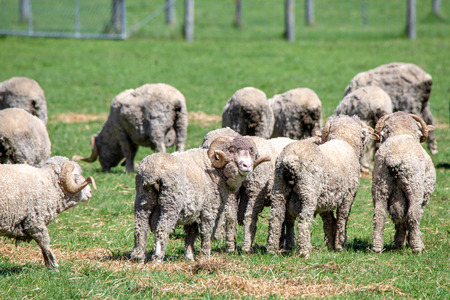 Merino rams with curly horns graze in a paddock in Canterbury, New Zealand
