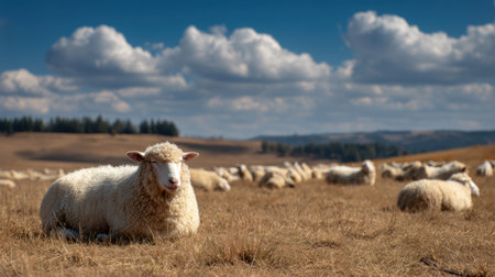 A peaceful scene featuring sheep grazing in a vast open field under a bright blue sky adorned with fluffy white clouds. The landscape evokes tranquility and rural charm.