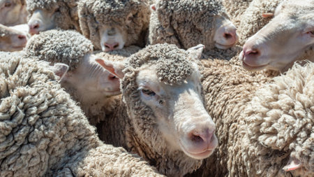 This image showcases a flock of sheep, captured in a close-up perspective. The animals exhibit creamy white wool, highlighted by warm sunlight. The shallow depth of field emphasizes the lead sheep. Suitable for illustrations related to nature, farming, and agricultural themes. It has potential for commercial or editorial applications.