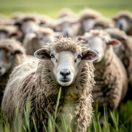 a flock of sheep energetically dashes across a lush green pasture, their hooves kicking up clouds of dust as they go. the image captures the essence of symbolic overload, with lens flares adding a touch of drama. the sheep's strong facial expressions convey a sense of urgency and determination. the color palette of light beige and beige creates a serene atmosphere. this photograph beautifully combines