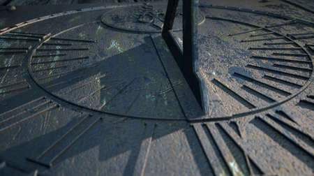 Closeup of sundial with gnomon at noon time, realistic 3d render