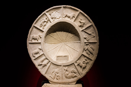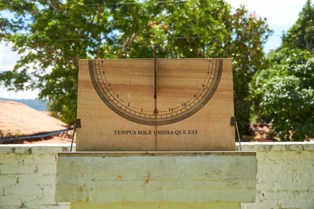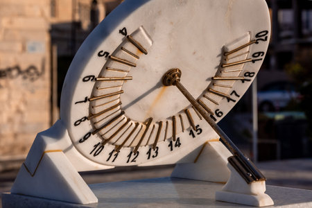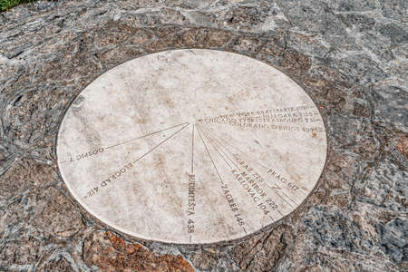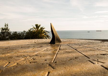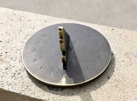 Ancient sun dial for telling the time using the sun. Made from stone. Close up. . High quality photo