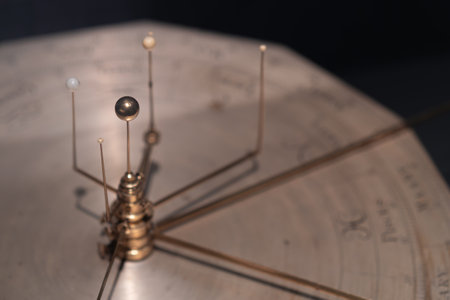 Brass mechanical orrery model showcasing the planetary alignment and orbital paths