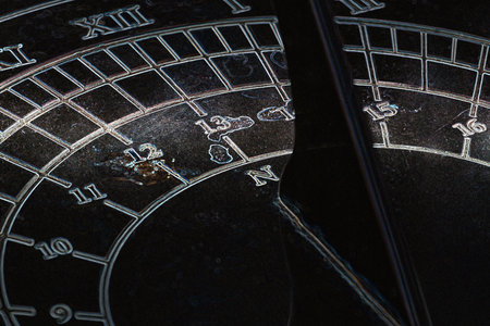 An extreme closeup of a section of an old vintage sundial clock made of scratched metal with roman numerals on a dark