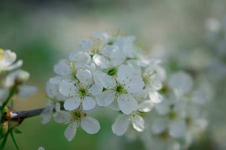 branch of cherry blossoms with white flowers in a spring garden, close up