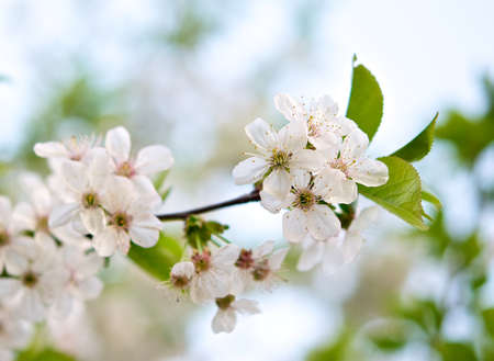 The beautiful tender sprig of cherry tree flowers on blurred blue floral background. Using as spring background natural