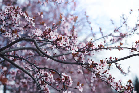 Pastel pink tree flower in the wild close up. Early spring blooming tree.