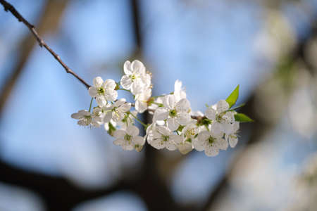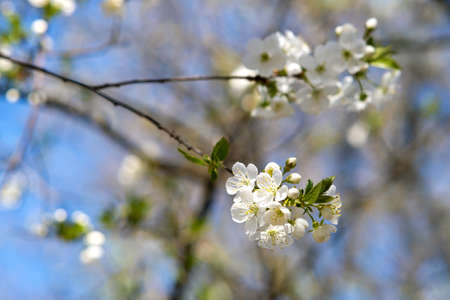 Fresh cherry tree branch with white flowers in a garden, against blue sky. Spring concept. Moody picture, soft selective focus, copy space