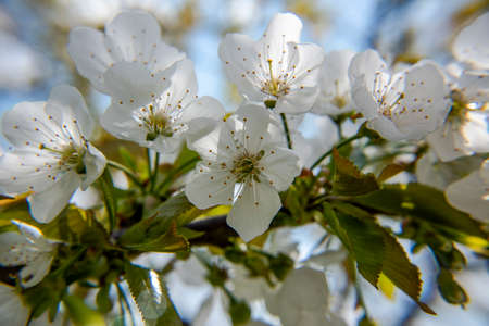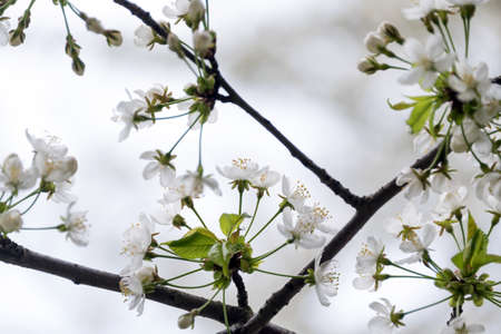 Closeup of white cherry flowers. Blooming cherry trees in the garden.