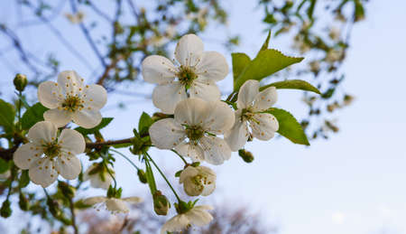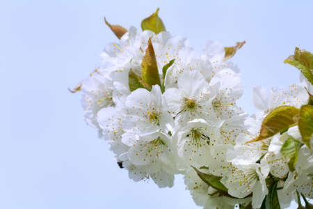 Close up of fresh white blooming flowers on a tree branches with blurred blue sky background in early spring.
