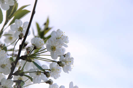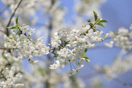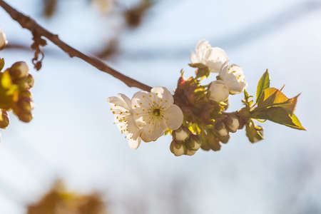 Blooming cherry. Delicate flowers of a cherry tree close-up. Blurred background of flowers and blue sky.