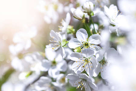 Spring background art with white cherry blossom. Beautiful nature scene with blooming tree and sun flare. Abstract blurred background. Shallow depth of field.