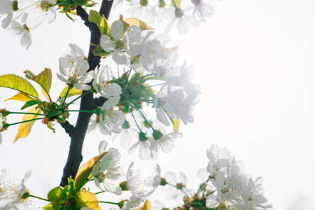 Branch of cherry tree with blooming white flowers in golden evening sun. Abstract spring seasonal natural background.
