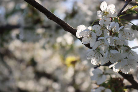 Dawn in the Cherry orchard in bloom. Close-up of white Cherry flower against sunlight. Prunus avium