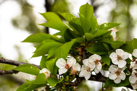 Blooming cherry tree in the garden. Spring seasonal of growing plants. Gardening concept background, floral style