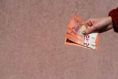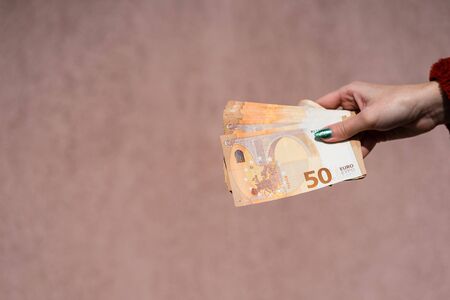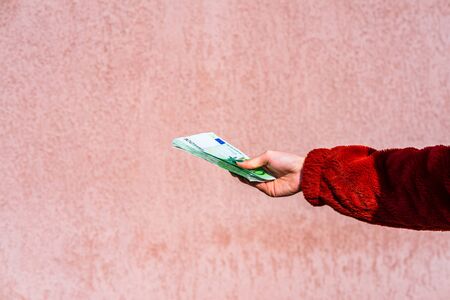 woman hands giving money like a bribe or tips. Holding EURO banknotes on a blurred background, EU currency