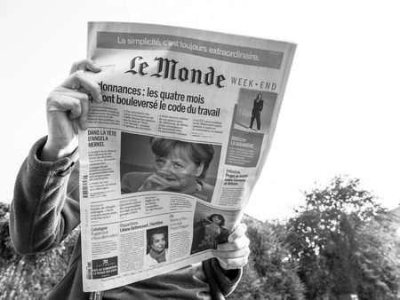 PARIS, FRANCE - SEP 24, 2017: View from below of woman reading latest newspaper Le Monde with portrait of Angela Merkel before the election in Germany for the Chancellor of Germany, the head of the federal government