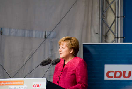 SELIGENSTADT, GERMANY – AUGUST, 2013 German Federal Chancellor Angela Merkel made a election speech on August 14, 2013 on the marketplace of Seligenstadt, Germany