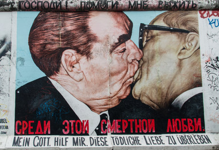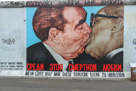 BERLIN, GERMANY - September 26, 2018: Close-up of the famous the The Kiss painting at the Berlin Wall, a symbolic piece made by the Soviet artist Dmitri Vrubel of Brezhnev and Honecker kissing
