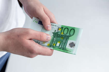 Closeup of businessman counts euro money in hands. Macro