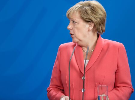 BERLIN, GERMANY - Aug 24, 2015: Chancellor of the Federal Republic of Germany Angela Merkel during a joint briefing with President of Ukraine Petro Poroshenko and French President Francois Hollande