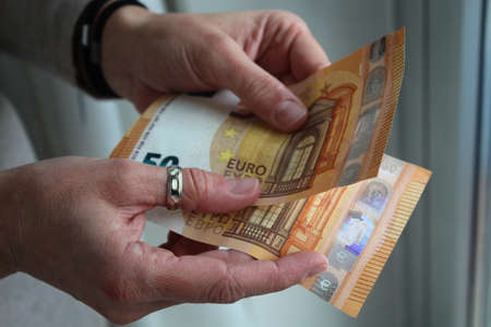 Human hands hold 50 euro banknotes on a beige background. Credit, corruption, bribery.