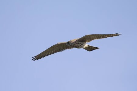 A common kestrel hovering in a clear blue sky hunting for mice.