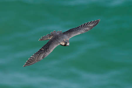 Peregrine falcon in flight with wings spread over rocky landscape. Concept of majestic birds, wildlife adventure, nature exploration, aerial grace.