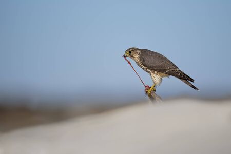 A Merlin tears into prey with red guts showing as its perched on a branch low on a sandy beach in the bright sun.