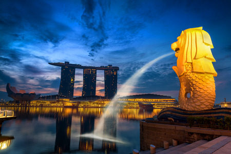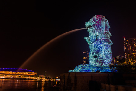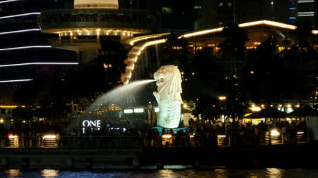 SINGAPORE-JULY 8, 2016: Merlion statue fountain in Merlion Park and Singapore city skyline at night on July 8, 2016. Merlion fountain is one of the most famous tourist attraction in Singapore.