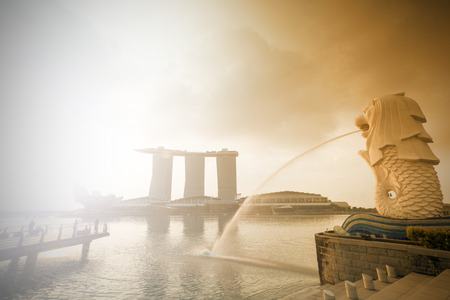 SINGAPORE-AUGUST 31: The Merlion beside Marina bay in Singapore view on August 31,2016. Merlion is a imaginary creature with the head of a lion,seen as a symbol of Singapore S