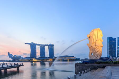 SINGAPORE-APRIL 30, 2018: Merlion statue fountain in Merlion Park and Singapore city skyline at sunrise on April 30, 2018. Merlion fountain is one of the most famous tourist attraction in Singapore.